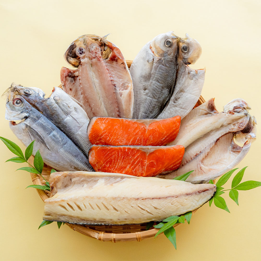 真あじ、銀鮭一夜干し、さば甘塩干し、シズなど当店の人気商品をお届けします。