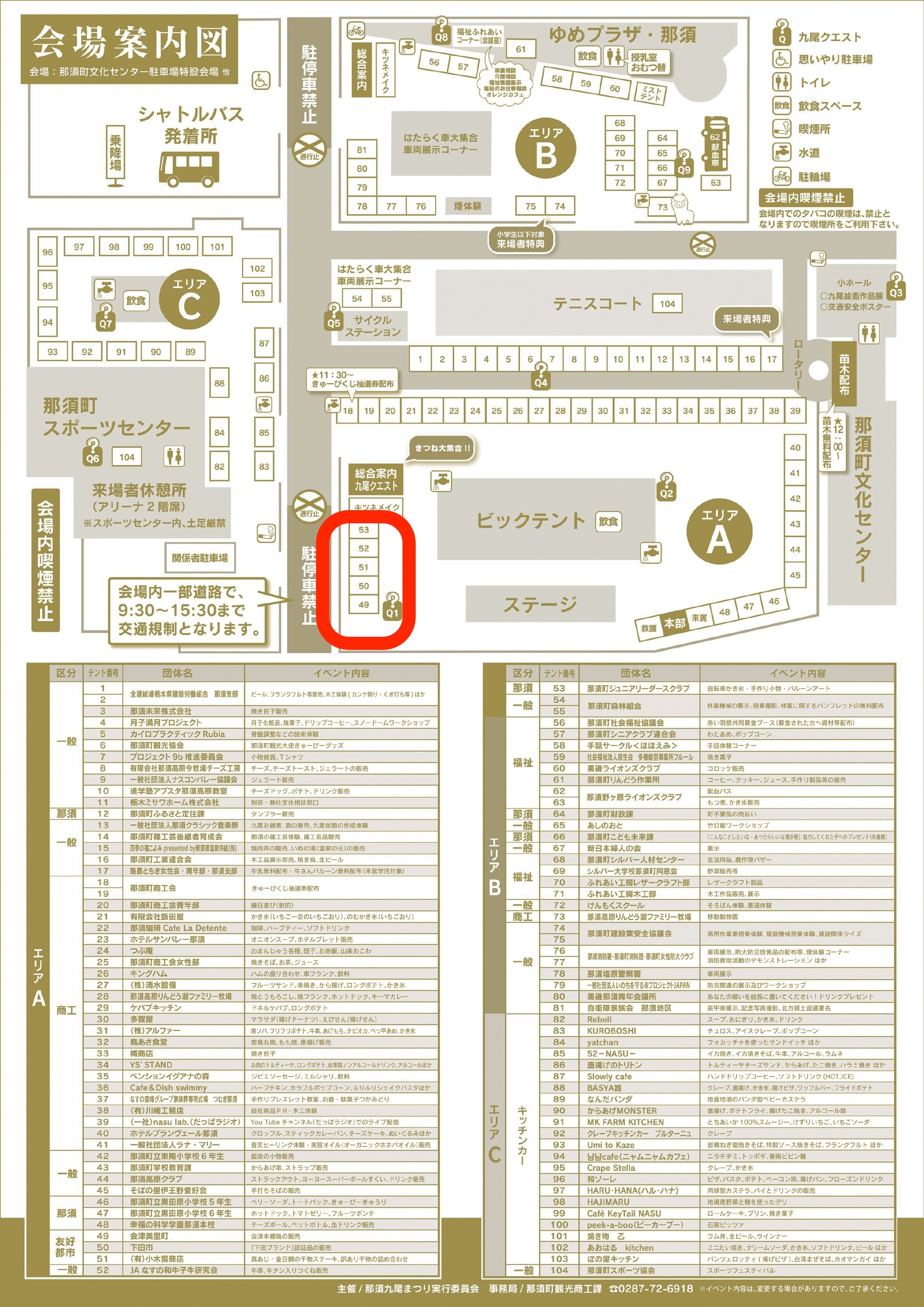 - 臨時駐車場・無料シャトルバス:那須町役場/黒田原小学校校庭/中央運動公園/那須中央中学校校庭/JAなすの那須支店/ふれあいタウン